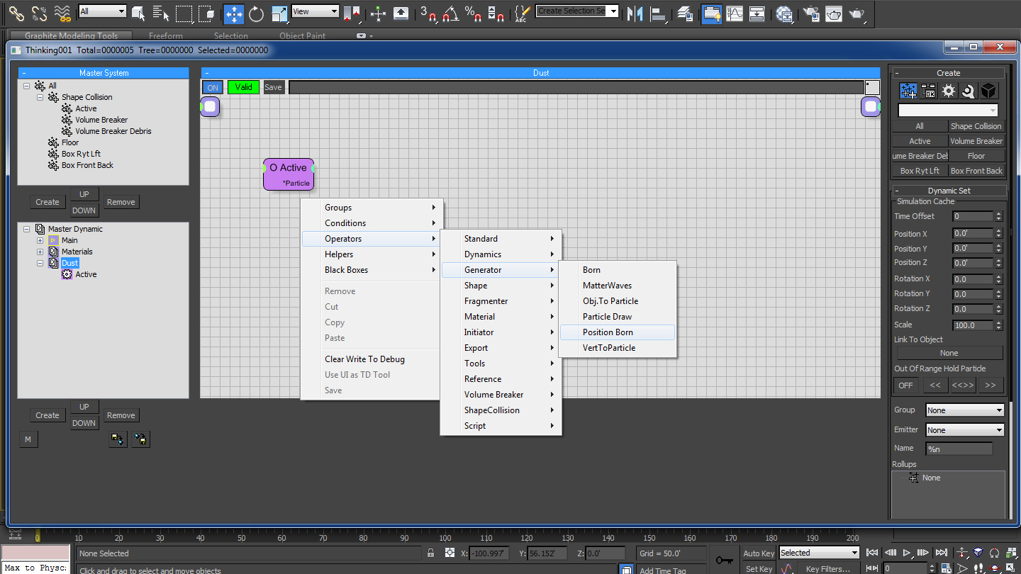 04.1 Create a new Dynamic Set with the name of ‘Dust’ under Master Dynamic Set. We will create Dust from the ‘Active’ group, hence we will bring in ‘Active’ group from the right click menu ‘Groups > Active’. Append a ‘Position Born’ Operator Generator from the right click menu ‘Operators > Generator > Position Born’, to the ‘Particle’ parameter.