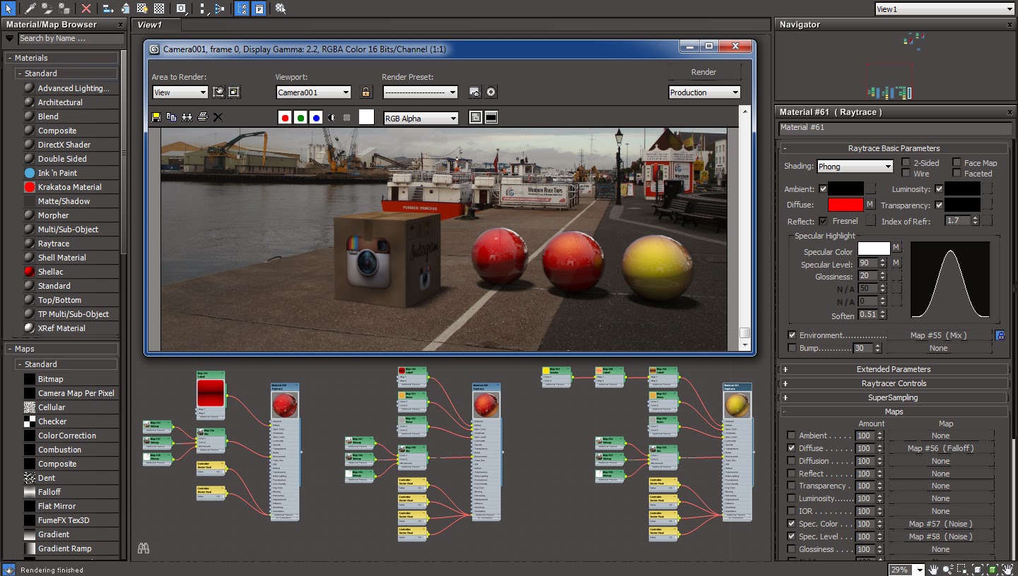 12 Create two more copies of sphere in the scene in order to see the effect of each material copy that we backed up in the Slate Material Editor. Assign all the backed up materials onto each copy of the sphere and hit render in order to see the final result.