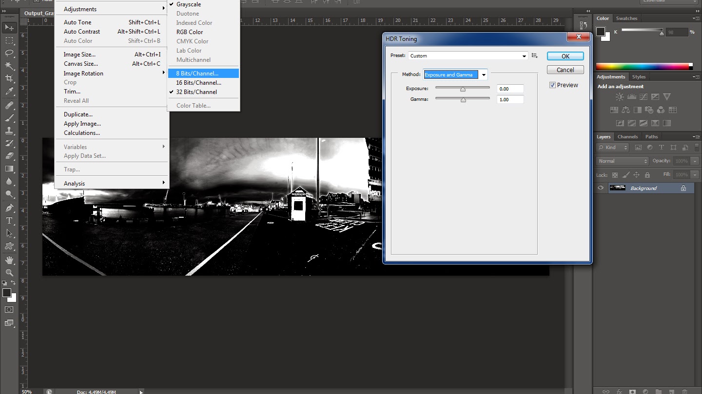 08 In order to save this modified version into a JPEG file we have to tone it down from 32bits/channel to 8bits/channel version from the ‘Mode’ options available inside the ‘Image’ menu. From the ‘HDR Toning’ dialogue box select the ‘Exposure and Gamma’ method for reducing the bits/channel amount. Save the file while renaming it as ‘Output_Grayscale.jpg’.