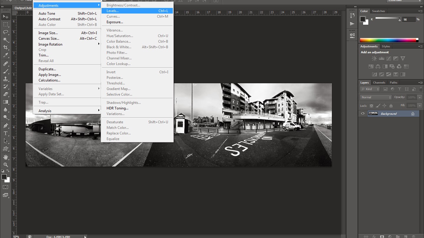 06 Open the HDR Image of the scene inside Photo-shop and convert it into a ‘Gray-scale’ Image from the ‘Mode’ options inside the ‘Image’ menu. We will further modify the gray-scale values of the image with the help of ‘Levels’ settings accessible from the ‘Adjustment’ options inside the ‘Image’ menu.