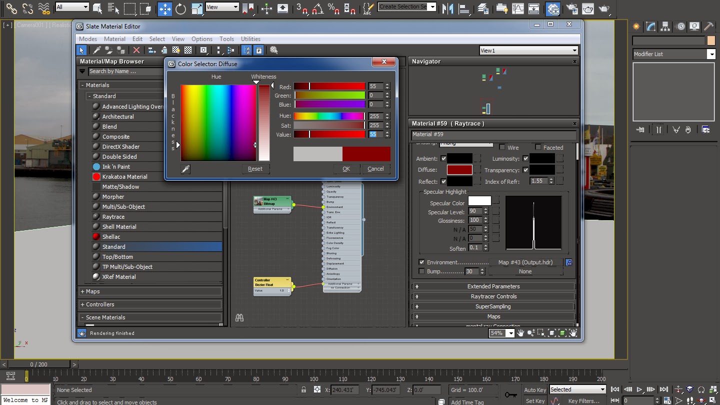 02 Add in the HDR Panorama Image of the scene inside the ‘Environment’ slot of the ‘Raytrace’ Material. Bring up the ‘Specular Level’ to ’90’ and ‘Glossiness’ to ‘100’ in order to get a super glossy metallic finish out of the material. Also change the diffuse color to a darker shade of red.