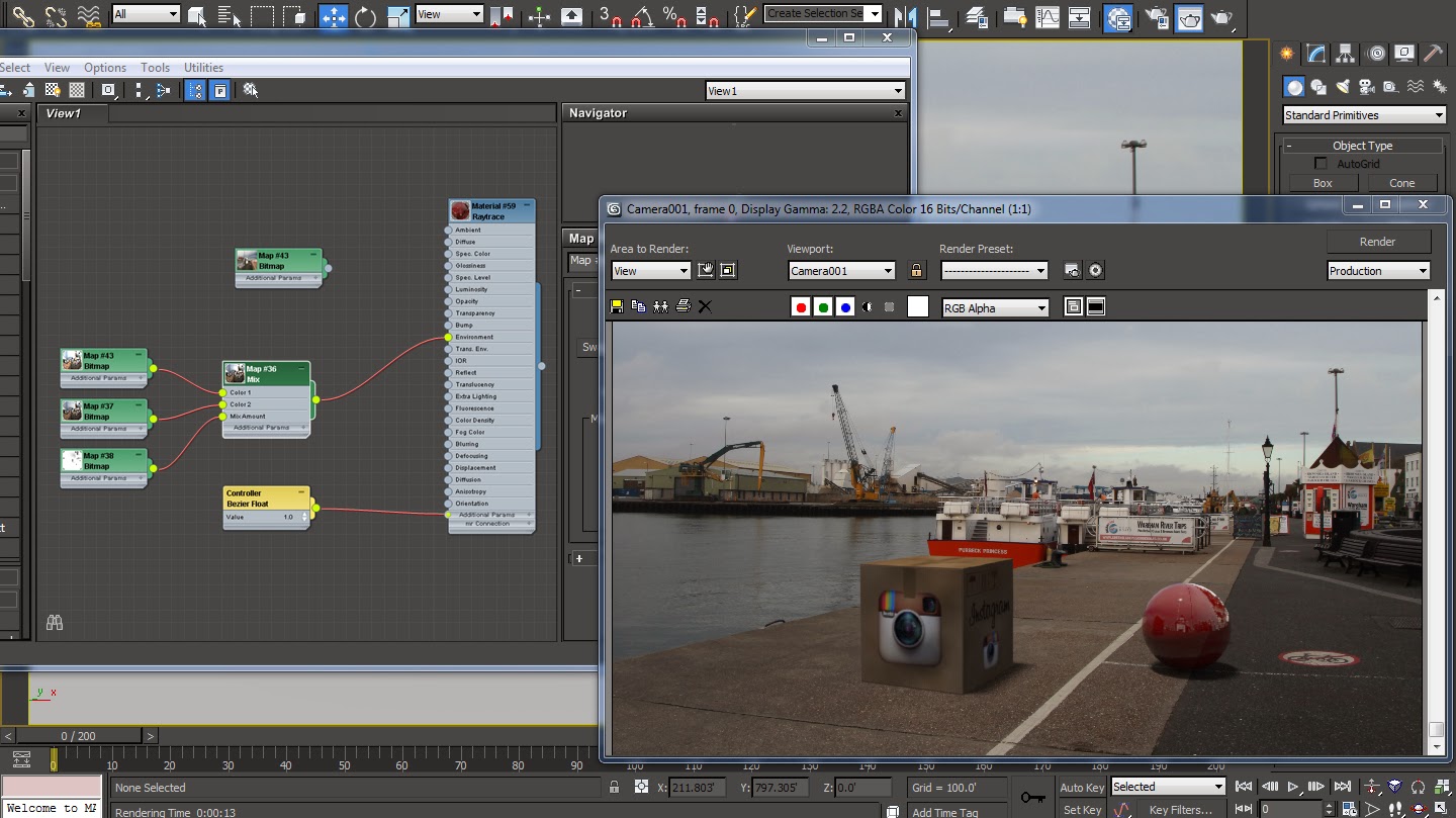 12 Now we will replace the ‘HDR Panorama Image’ linked to the ‘Environment’ map slot of our Raytrace Material with the new ‘Mix Map’. Hit render in order to see the result achieved by us so far.