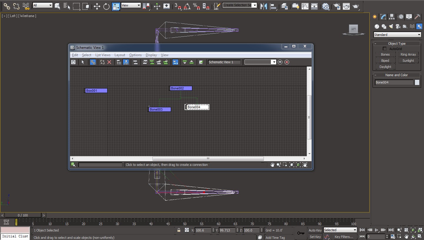 04 Now in order to make the bones of the flap to be the child of the side bone we have to connect both the flap-bones into the side-bone inside the schematic view. Schematic view can be accessed through the ‘Graph Editors’ menu and by selecting ‘New Schematic View’. Connect ‘Bone004’ with ‘Bone002’ by the help of connect tool that can be found as the third icon in the ‘Schematic View’ toolbar.