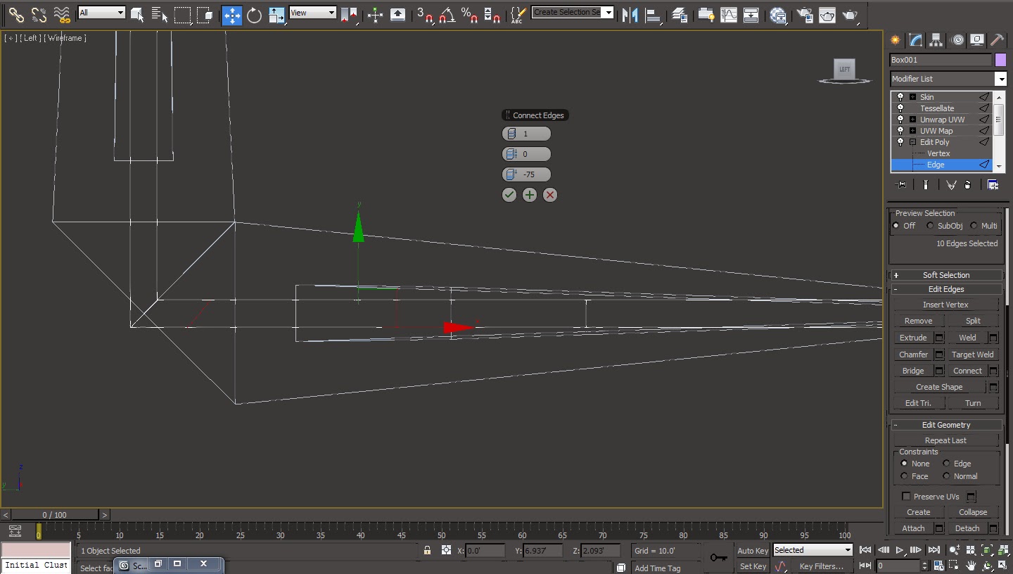 09 Now as we want the corner of the cardboard box to act as a break point between the side and the flap we have to add some more edges to the corner geometry of the cardboard box. Open up the ‘Edit Poly’ modifier tool stack and select the ‘Edge’ selection tool. Select the perpendicular edges to the corner edge and hit the ‘Connect’ tool from the ‘Edit Poly’ modifier parameters. Bring down the value inside ‘Slide’ parameter to ‘-75’ in order to create a new loop of edges closer to the corner edge loop.